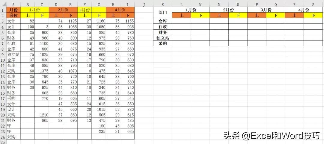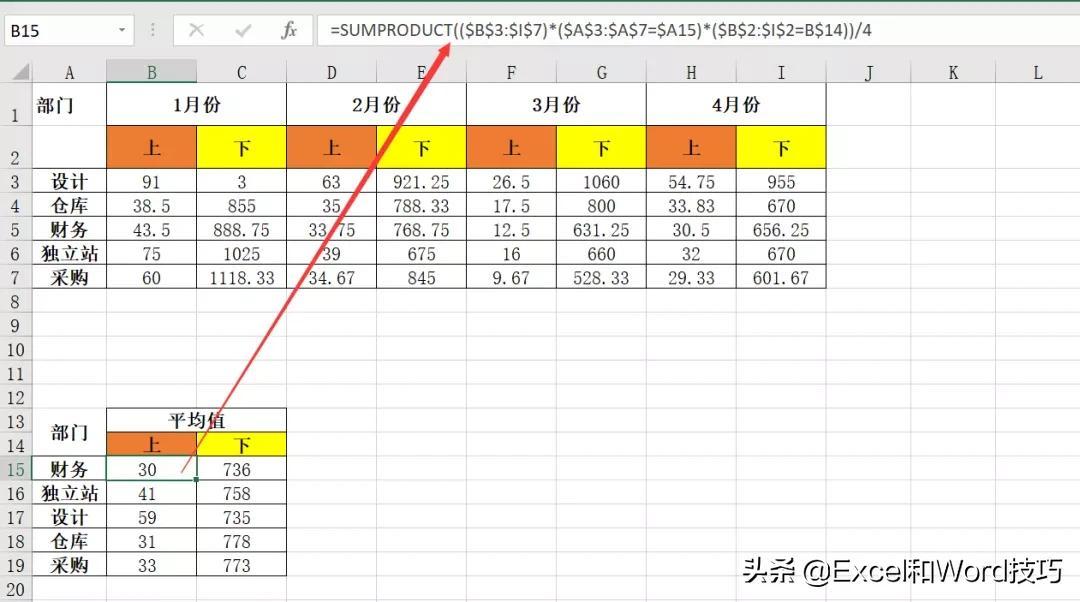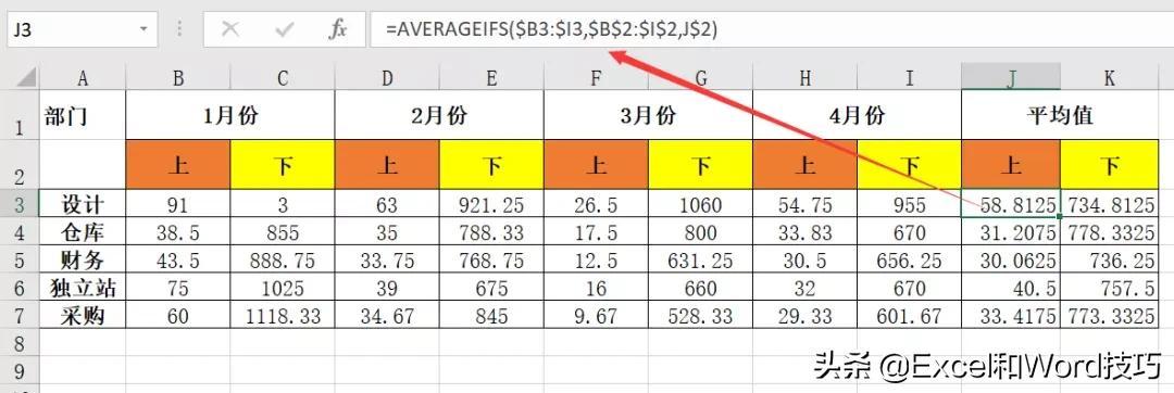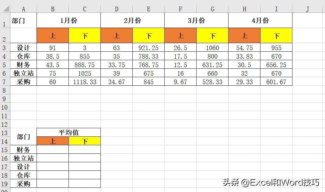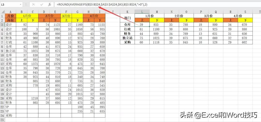 如图所示,如何根据部门和月份求对应的平均值,注意这里不计算空单元格的个数?