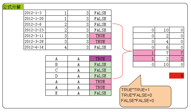 在四则运算里,TRUE等同于1,FALSE等同于0。如果要求A产品3月的销售量,公式为=SUMPRODUCT((MONTH(A2:A8)=3)*(B2:B8=”A”)*C2:C8),公式分解如图3-9-16所示。