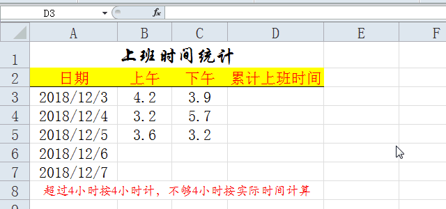 接下来我们看另外一个例子,从图中我们可以看出需要求一天的累计上班时间,其中超过4小时按4小时计,不够4小时按实际时间计算,我们的思路应该是将各个上班时间跟4进行对比取最小值相加,可是当我们用公式=MIN(B3,4) MIN(C3,4)来计算的时候发现在没有时间的地方会默认为上班8小时。