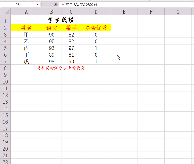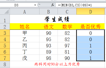 最后一个例子,从图中我们可以看出需要找出哪些学生成绩为优秀,其判断条件是两科同时于90分以上。我们的思路应该是将两科成绩进行求最小值,得到的结果大于89分即为优秀,公式为=(MIN(B3,C3)>89)*1,在得到的结果中数值为1的就是优秀的同学。