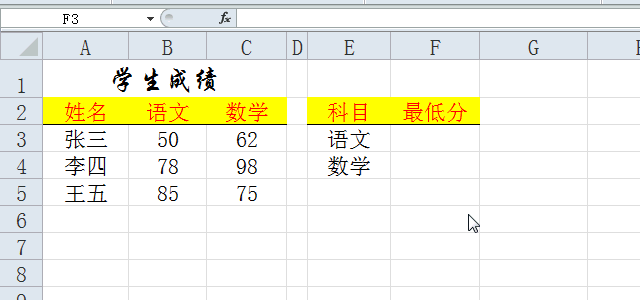 我们先看一个简单的例子,从图中我们可以看出需要求每一科的最低分,我们可以直接用=MIN(B3:B5)即可实现我们的要求。