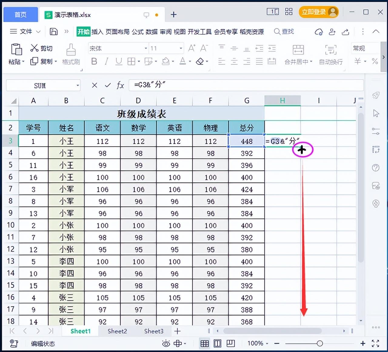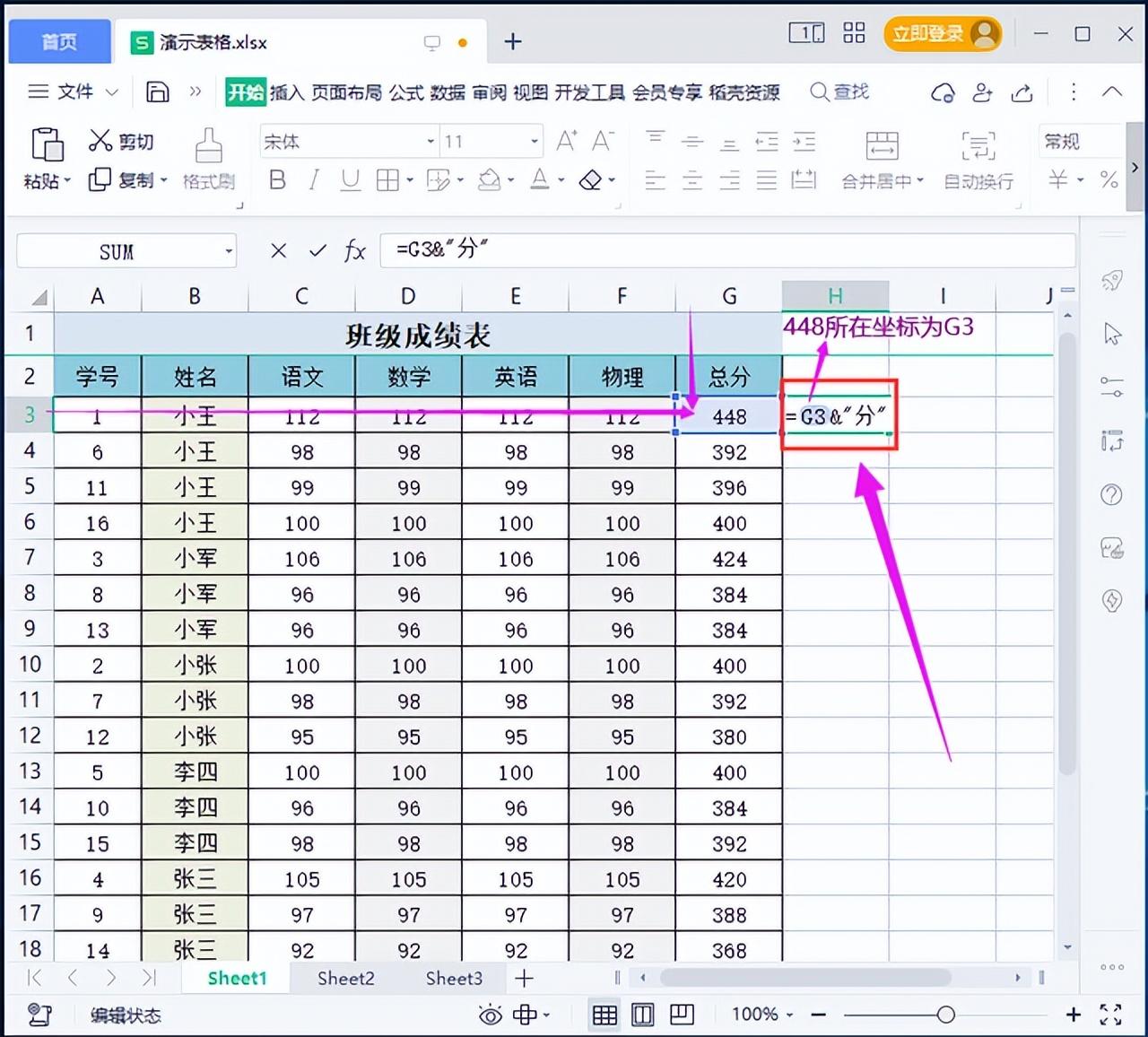 (1)打开一个要编辑的Excel工作表,例如对总分列批量添加后缀“分”字,选择新的单元格,为了方便操作选择相邻的那个单元格就行,然后在单元格里面写入公式“=”前缀”&原内容单元格编号”或者“= 原内容单元格编号& “后缀”。这里应该注意引号要在英文状态输入才管用,连接符“&”应同时按住“shift 7” 输入。如下图所示输入“=G3&“分””,其中G3为第一个总分448所在的位置坐标。