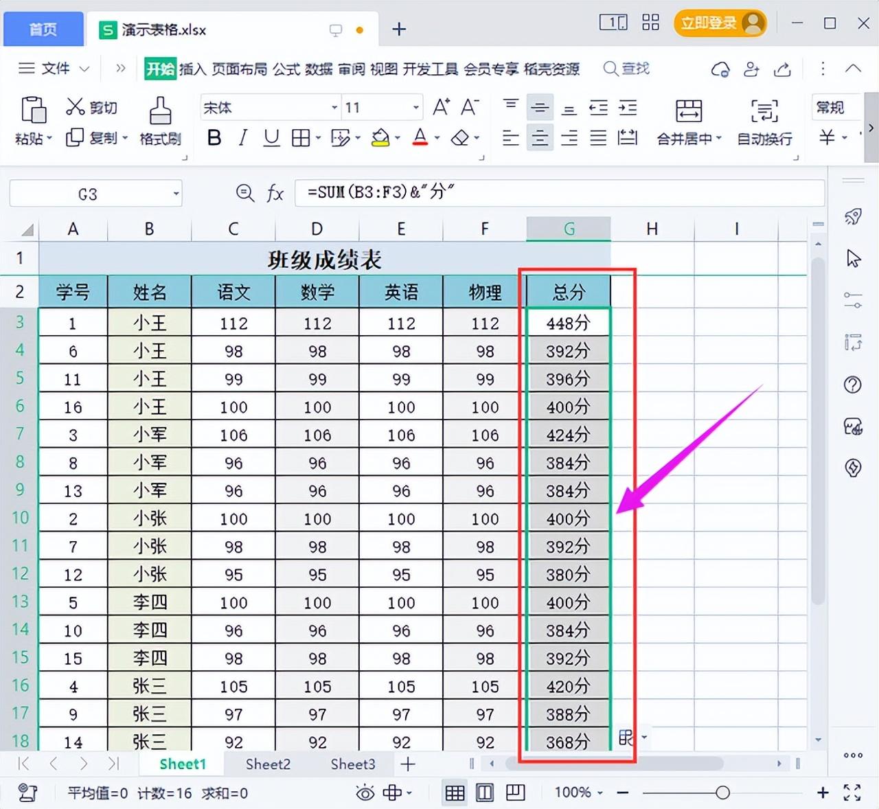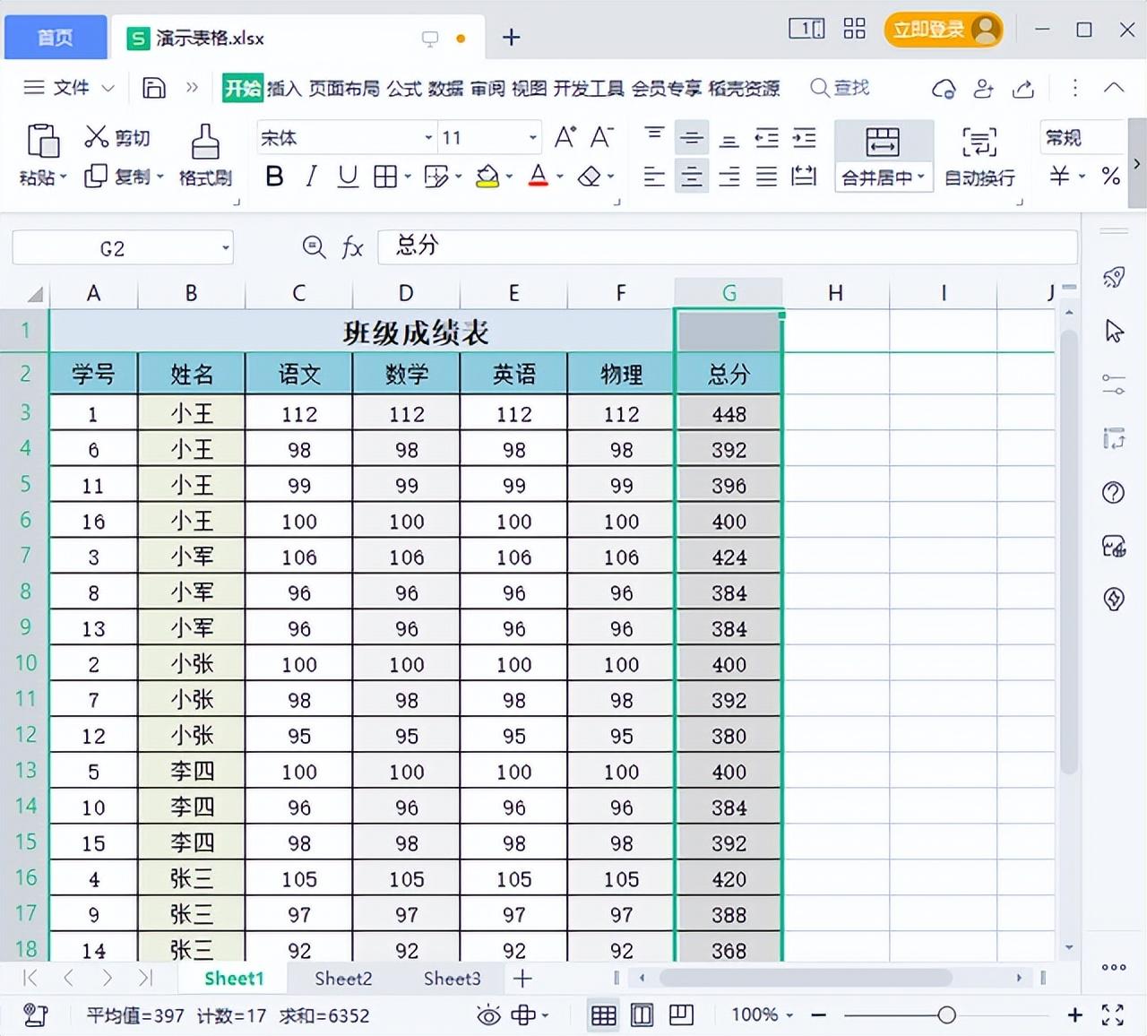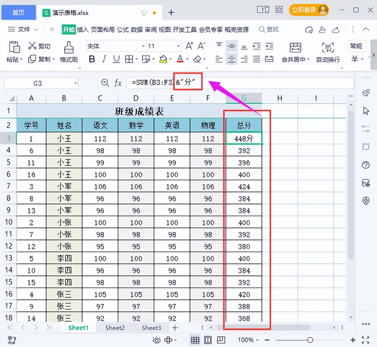 (1)首先打开一个要编辑的Excel工作表,例如对总分列批量添加前缀或后缀。