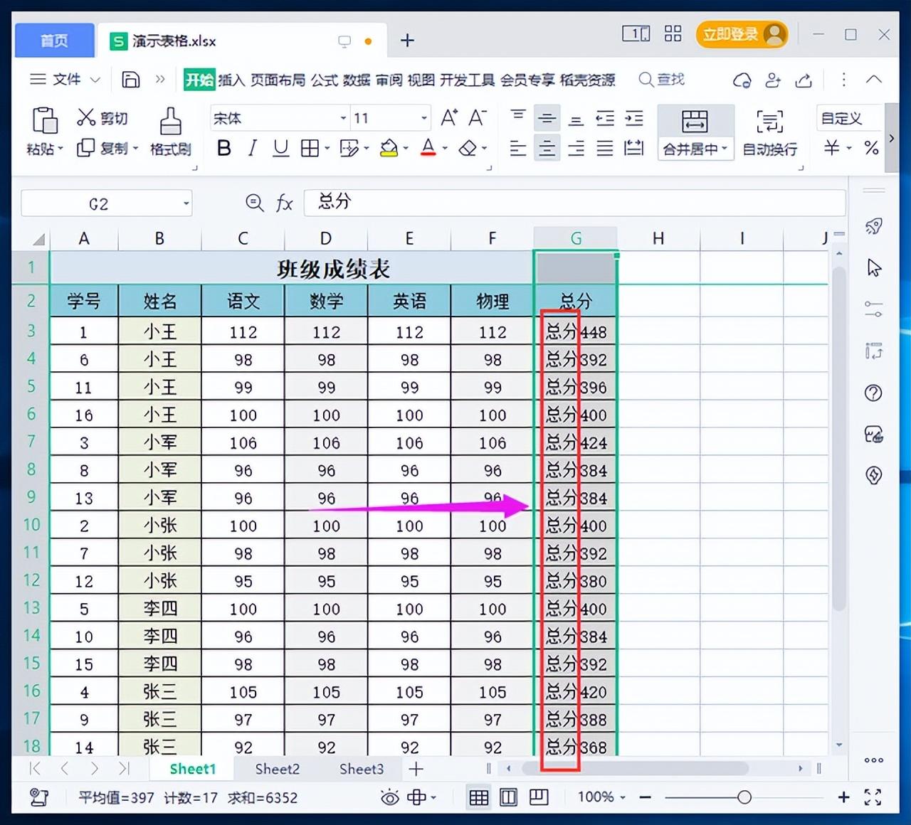 添加好要加的前缀内容后,点击下面“确定”按钮,此时我们会看到表格中的总分列前面已被批量加上了总分两字如下图所示。