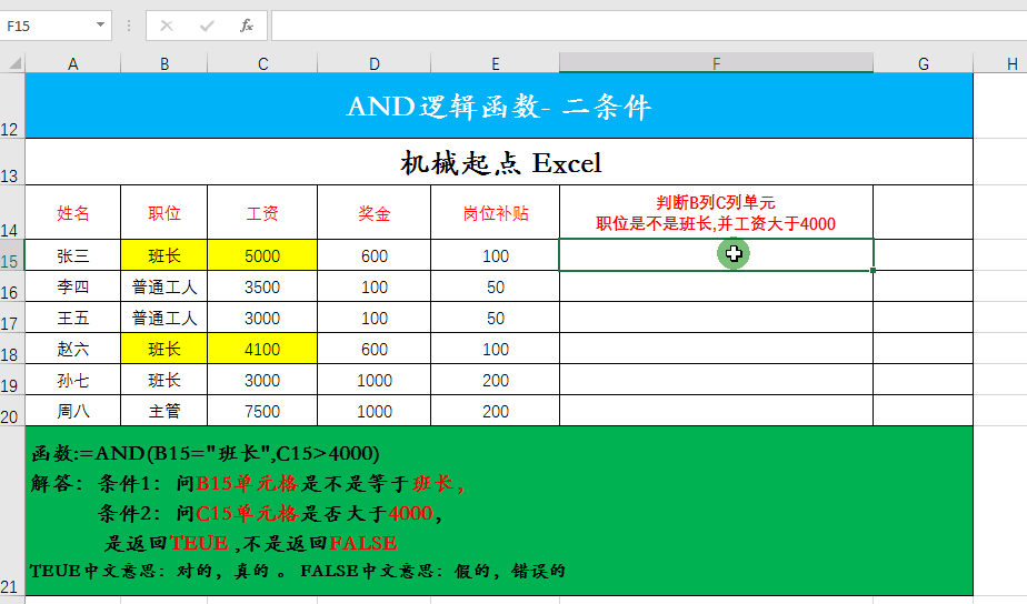 函数:=AND(B26=”班长”,C26>4000,D26>1000)