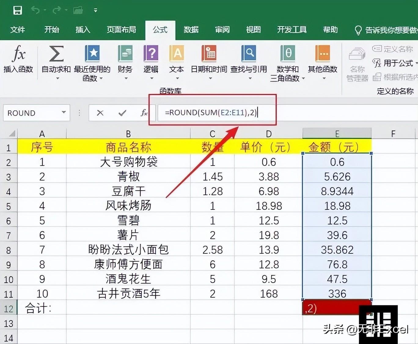 如下图所示,如果公式更改为:=ROUND(SUM(E2:E11),0),则表示取整到个位。
