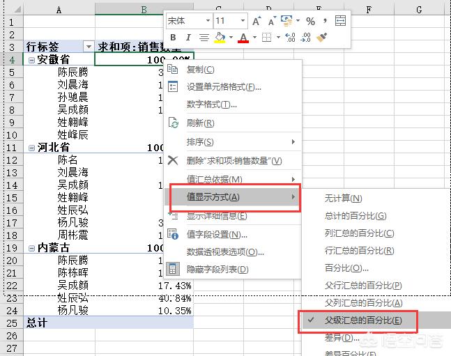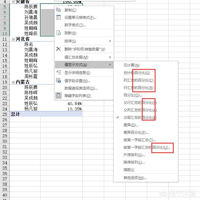 2、右击,选择值显示方式-腹肌汇总的百分比