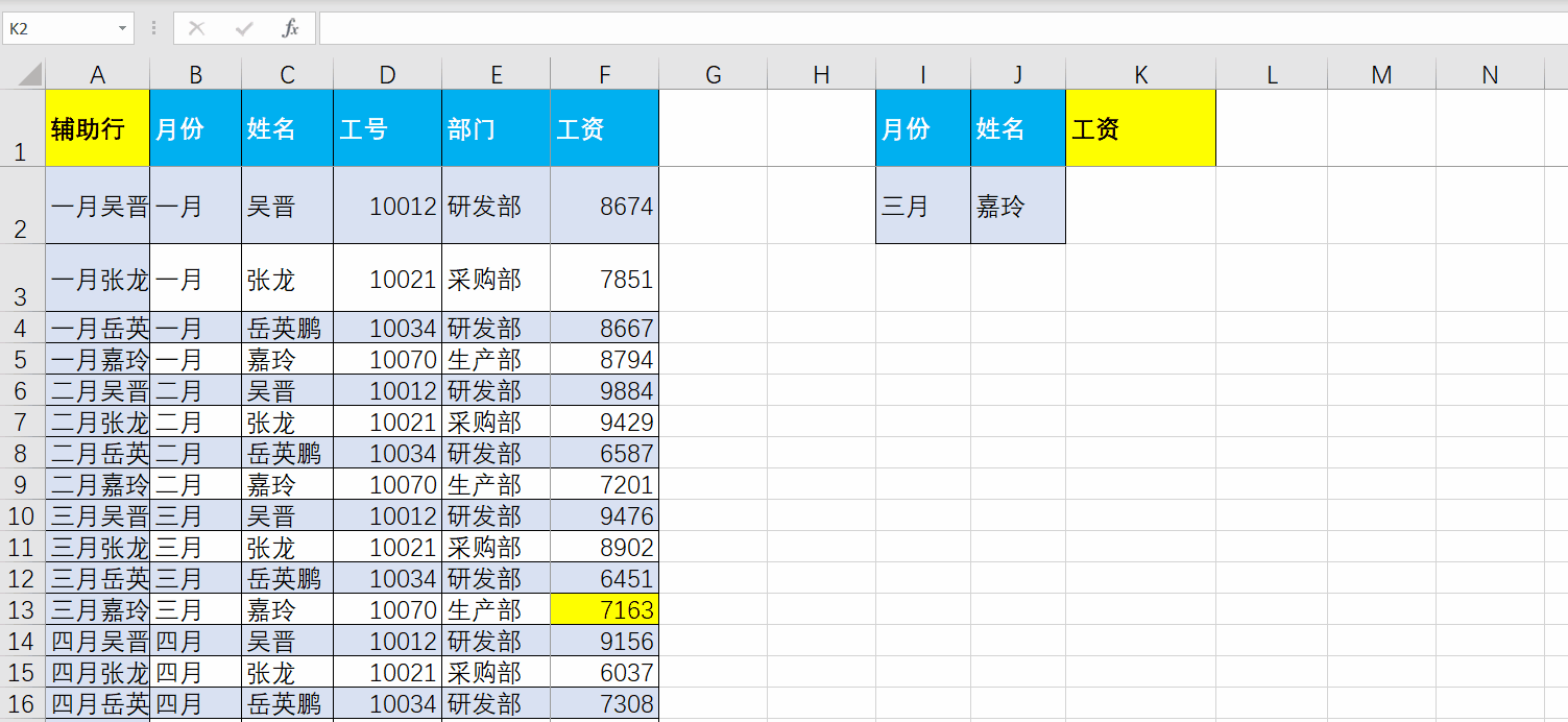 如下图,我们要查询三月份嘉玲的工资。条件1为三月, 条件2为嘉玲, 查询结果为工资。