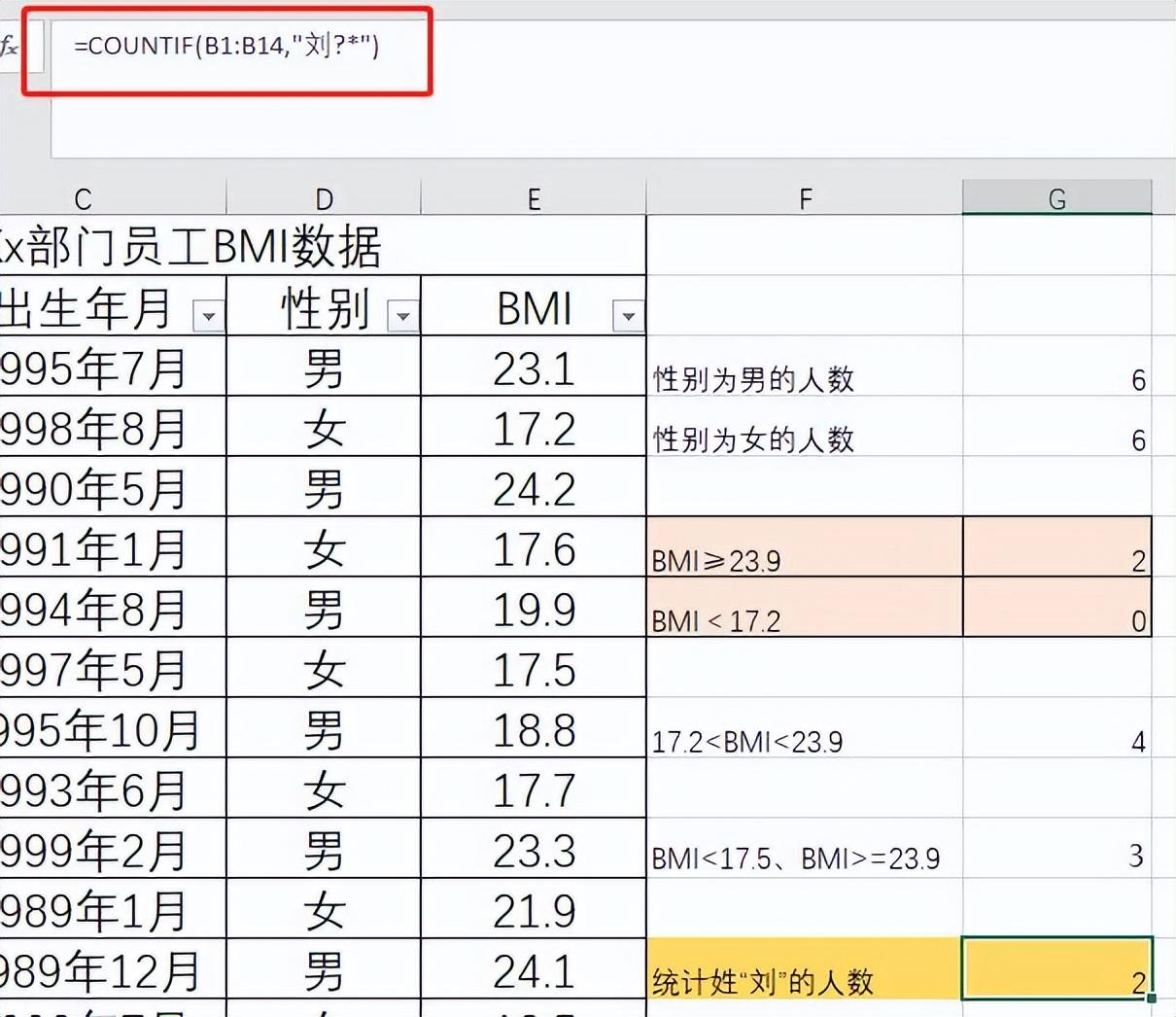 可以参考姓名第一个字为”姓“;公式应为=COUNTIF(B1:B14,”刘?*”)