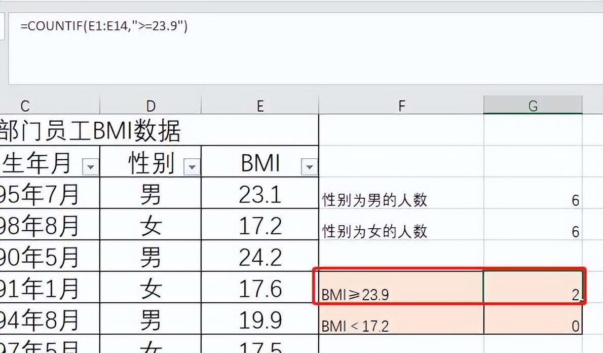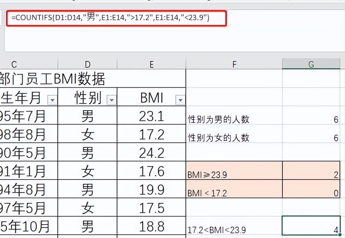 公式应为 =COUNTIFS(D1:D14,”男”,E1:E14,”>17.2″,E1:E14,”<23.9″)