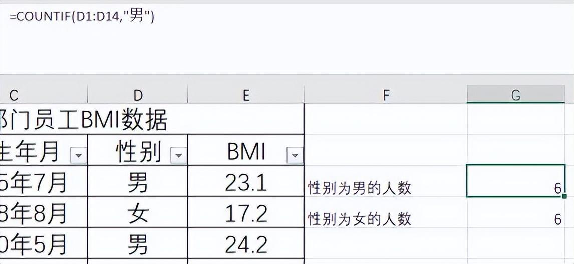 1、分别统计性别一列中该部门 男、女的人数,判断条件给出的是”文本”