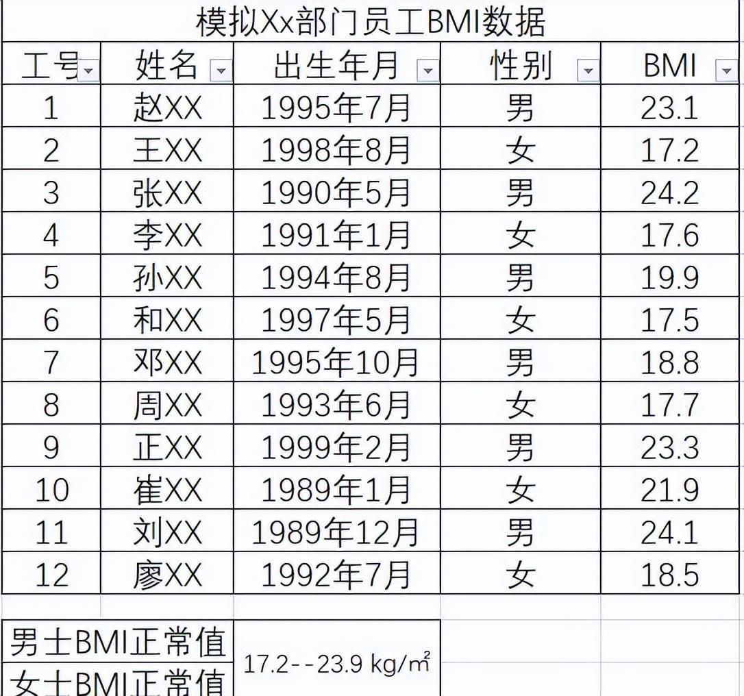 给出条件:假设这是某个部门的员工BMI数据,为了保证他们的身体健康,我们需要统计相关的BMI数据信息,表格从A1位置开始.