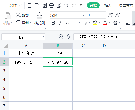 从图1 可以看到,当前日期TODAY()-出生年月A2,得到的是天数。一年365天,所以用天数除以365就得到图2 所示年龄。