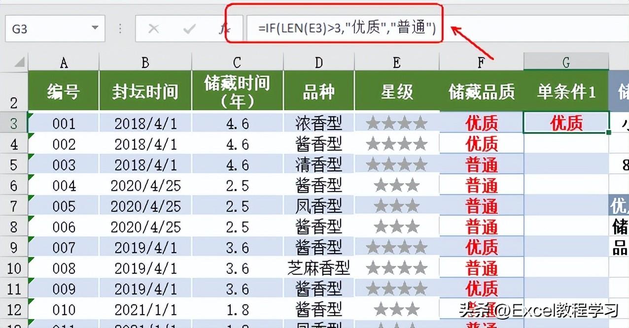 这个公式的含义是当E3单元格的字符数大于3,则返回结果为”优质“,否则返回结果为“普通”。