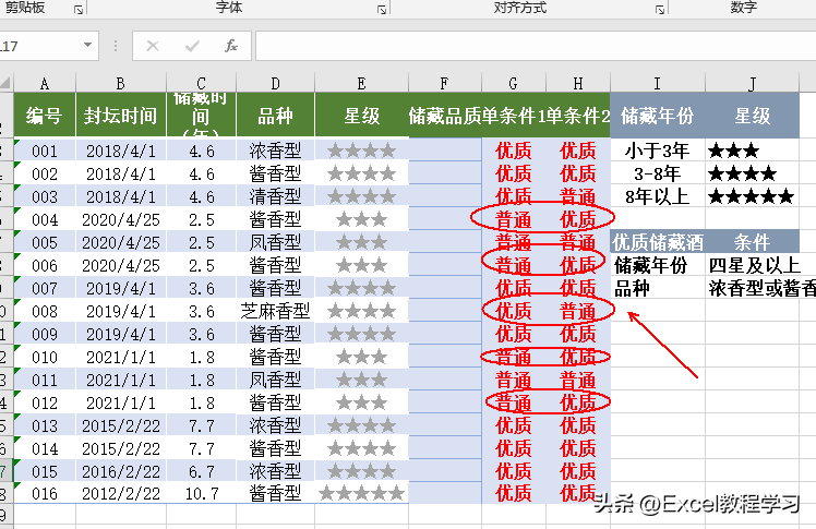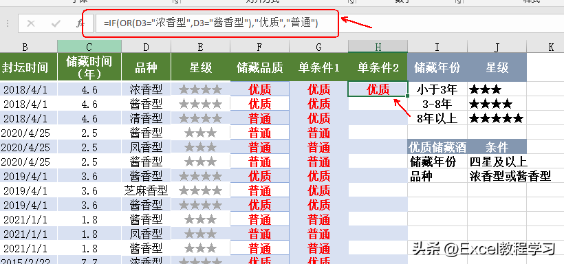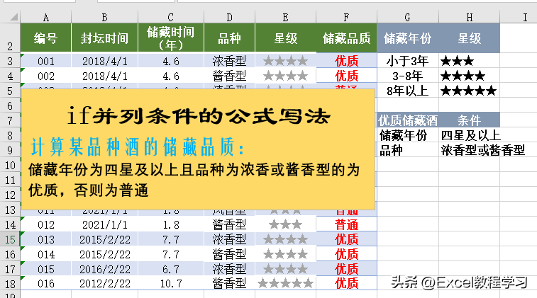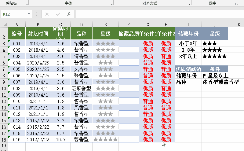如下图所示,要计算某品种酒的储藏品质,数据表设置两个并列条件,分别为: