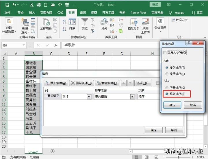 对文本排序Excel默认是按照首字母排序,Excel还可以按照首个文本笔画数排序,在要排序的列中选择一个单元格,在“数据”选项卡上的“排序和筛选”组中,点击“排序”命令按钮,弹窗点击“选项”,方法中选择“笔划排序”确定即可。