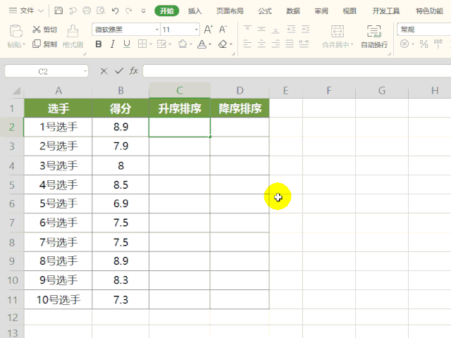 按升序排序公式:=RANK(B2,$B$2:$B$11)