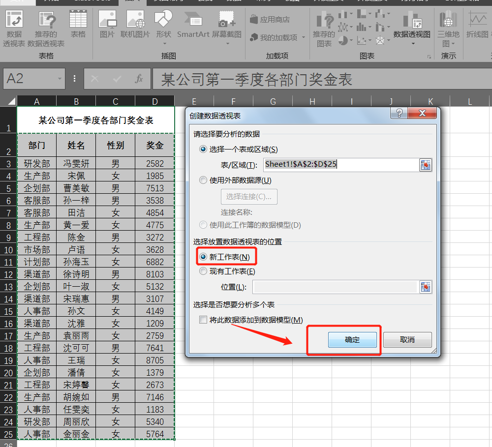 - 步骤2、在【创建数据透视表】的对话框中是【选放置数据透视表的位置】是新建表格,然后确定即可,如下图所示:
