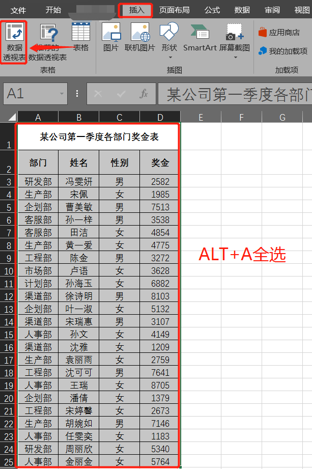 - 步骤1、首先,【ALT A】全选中总表中的数据,然后选择【插入】,再需选择【插入数据透视表】