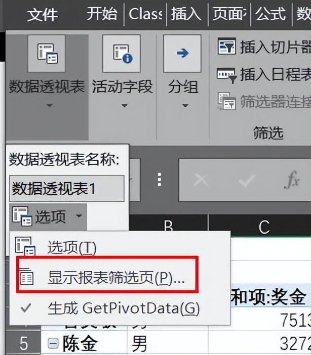 - 步骤4、在Excel的【分析】里选择【数据透视表】,然后选择【选项】下方的小黑三角,然后选择【选择报表筛选页】,如下图所示: