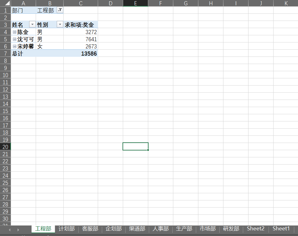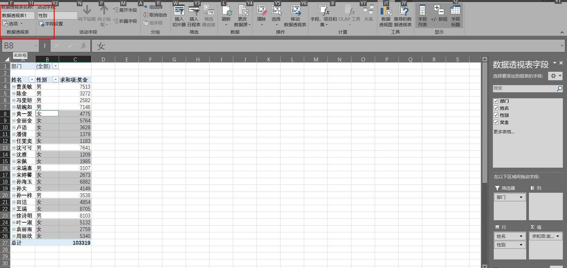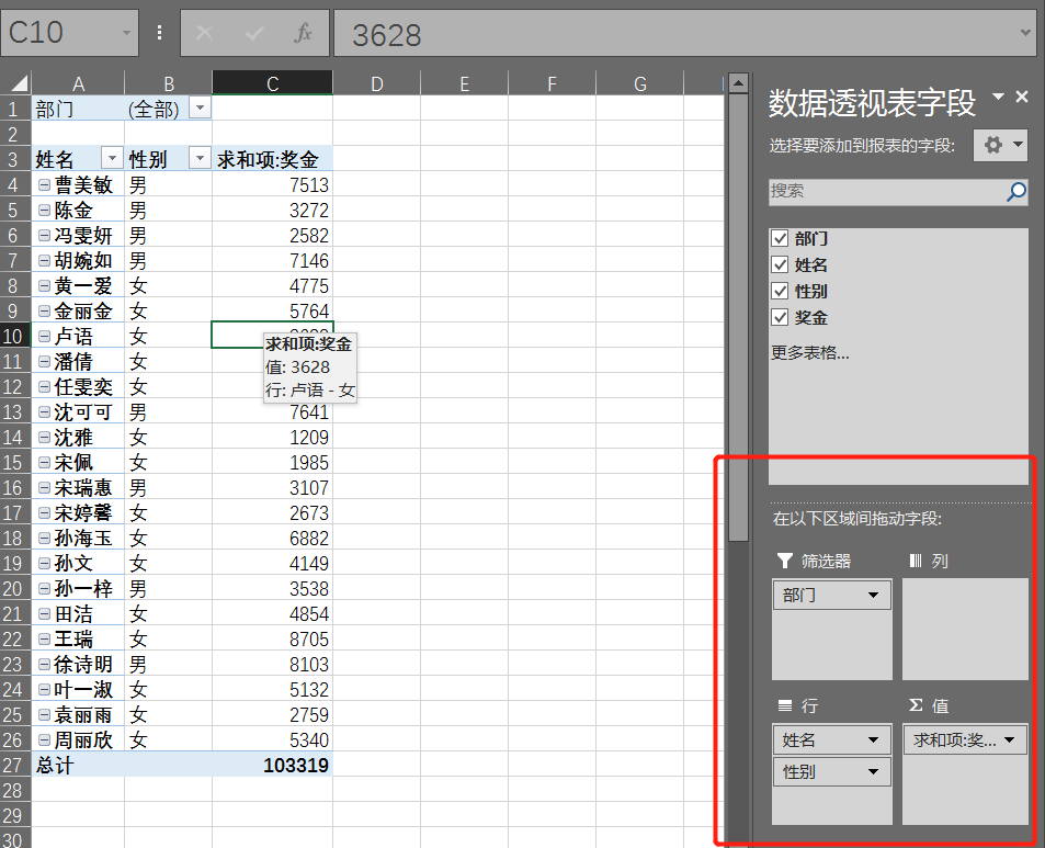 - 步骤3、插入数据透视表之后,在【数据透视表字段】处将【部门】字段放入【筛选器】,【姓名】和【性别】的字段放入【行】,【奖金】字段放入【值】