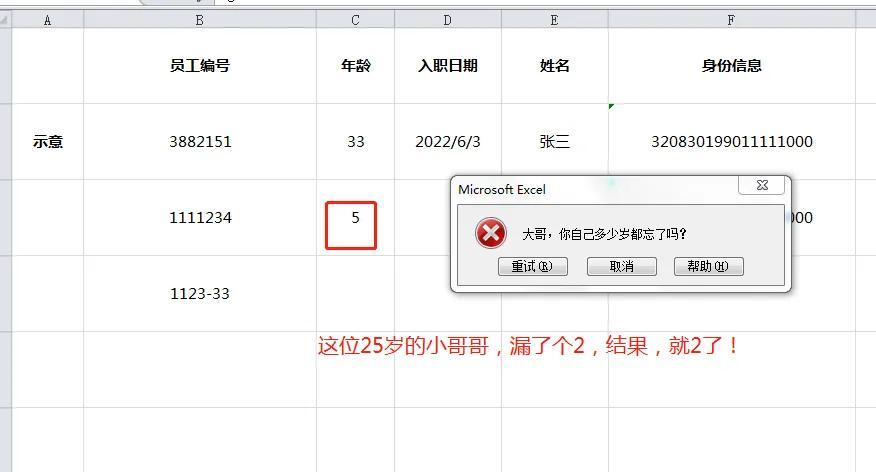 如果你还想设定年龄的输入条件,比如不能小于20岁,不能大于60岁,也都是可以实现的。