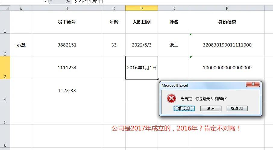 设定好入职日期的限定条件:日期大于公司成立日期,小于今天。有填写超出范围的,也会自动报错,不让你确定哦,是不是也挺智能的?