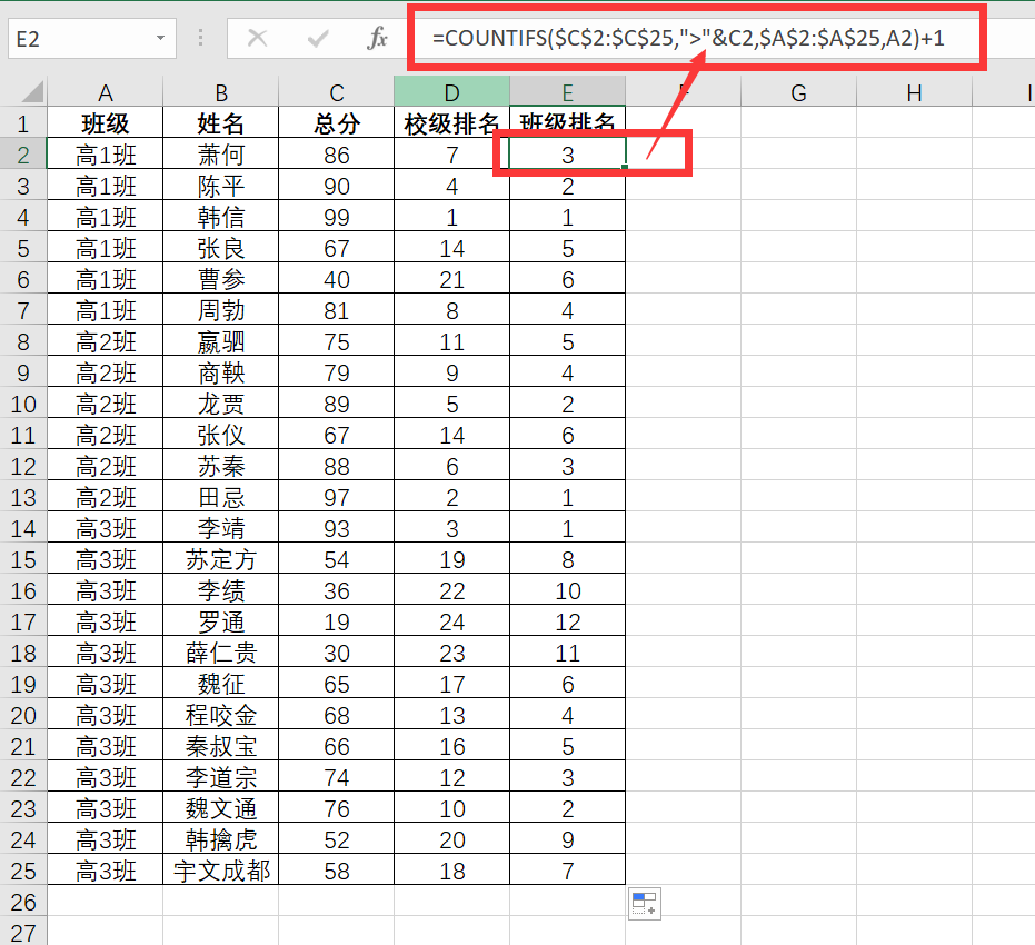 1、在E2单元格中输入公式:=COUNTIFS($C$2:$C$25,”>”&C2,$A$2:$A$25,A2) 1,并向下填充。
