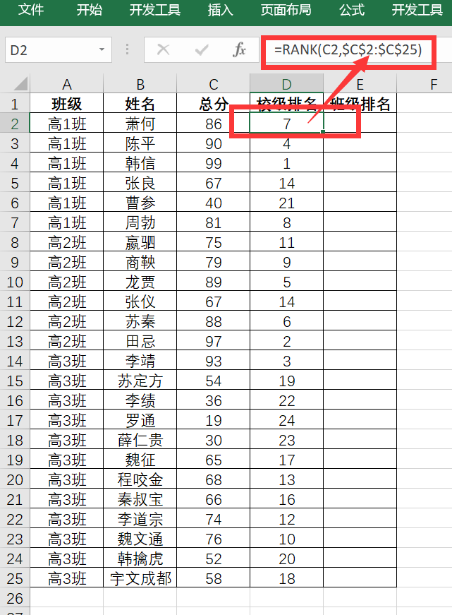 1、在D2单元格中输入公式:=RANK(C2,$C$2:$C$25),向下填充。