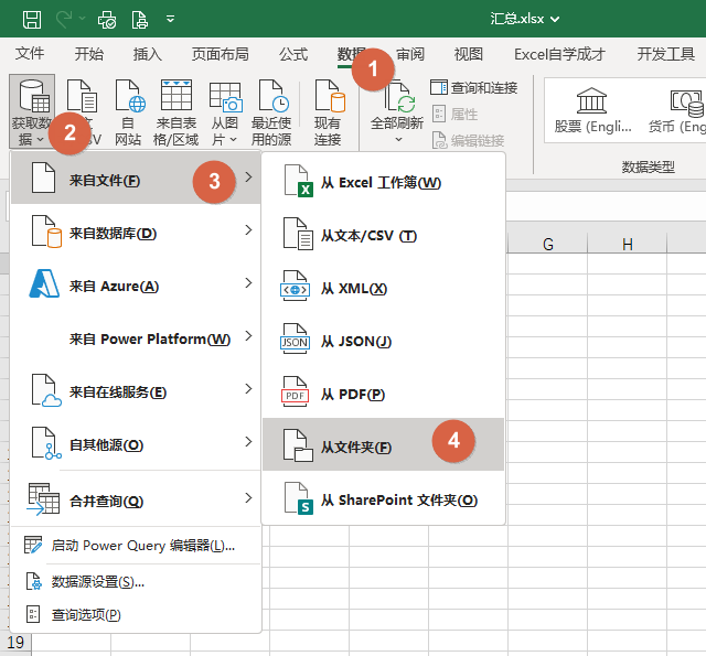 第二步,我们我们点击数据选项卡,点击获取数据,点击来自文件,选择从文件夹