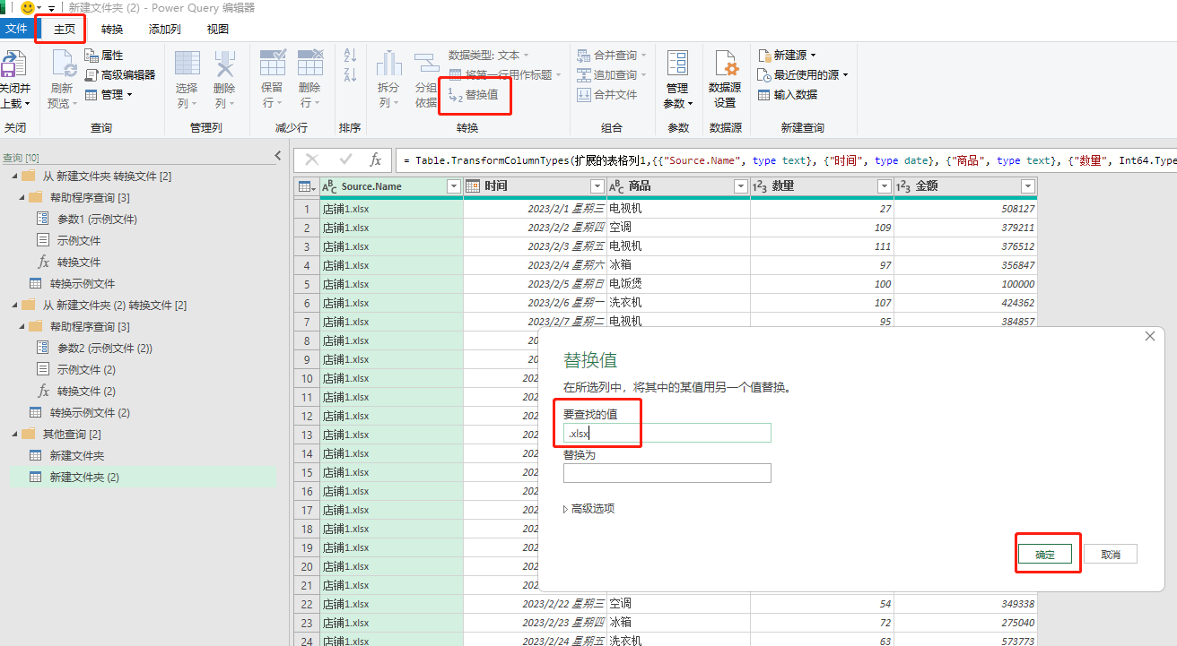 这样的话,PQ会自动的将文件夹内所有的工作簿的数据合并至一张表里面了,如下所示,我们需要点击替换值,将.xlsx给替换成空白