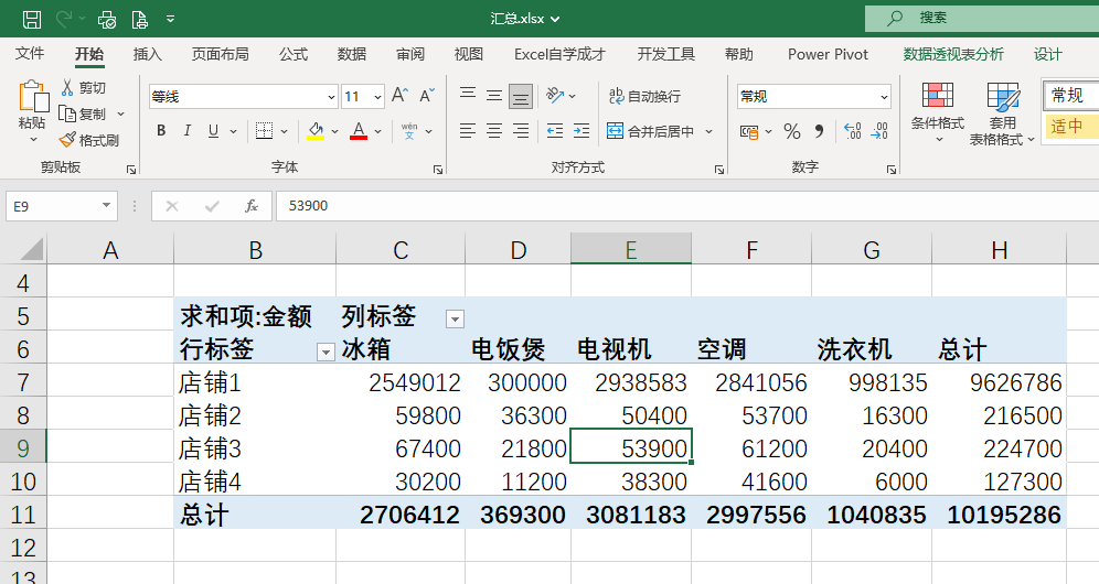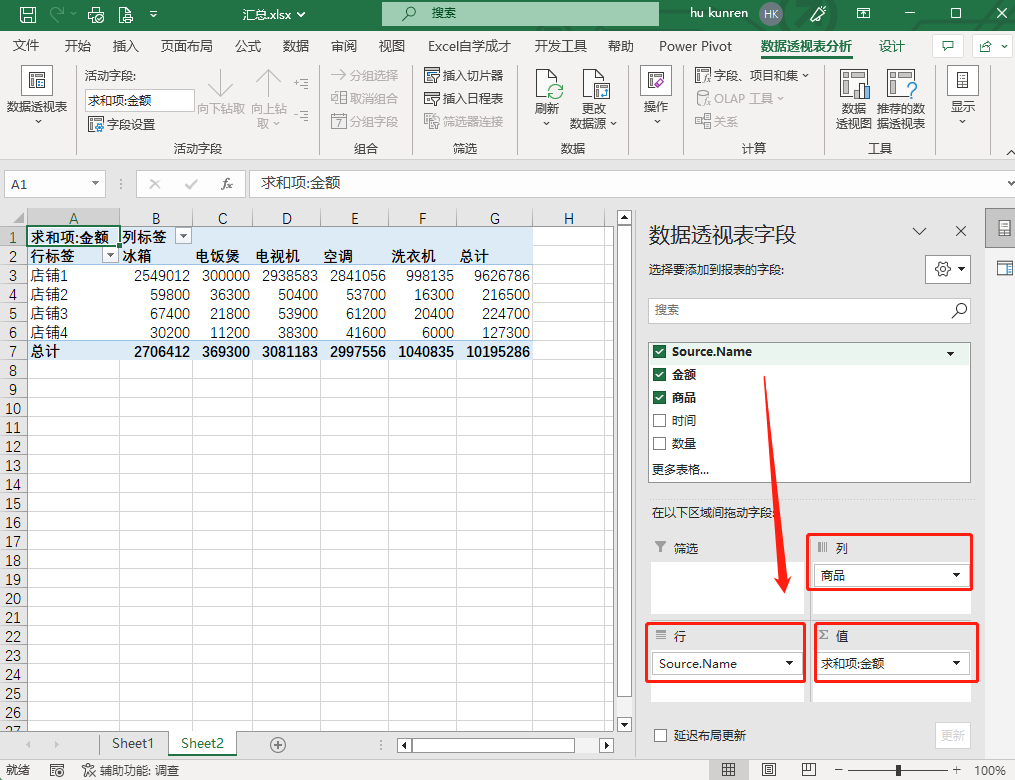 分别将Source.Name放入行标签,将商品放入列标签,将金额放入值,这样左边就生成了一个数据透视汇总了