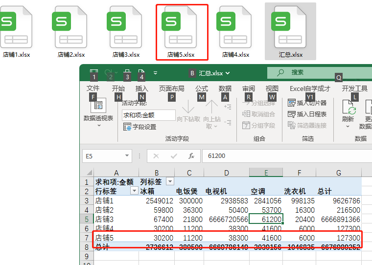 或者说我们在表格里面新建了一个工作簿,店铺5,那个汇总表里面数据也能自动的更新过来