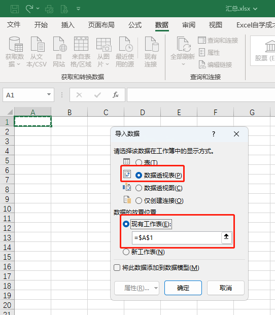 我们选择数据透视表,然后把数据放在现有工作表的A1位置,如下所示