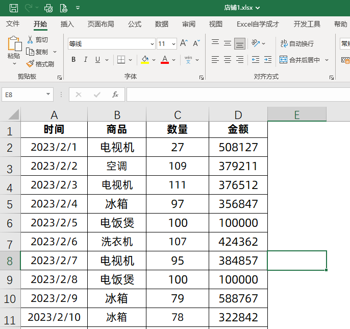 然后每个店铺的工作簿里面的数据格式是一样的,记录的是各店铺的销售流水数据,如下所示: