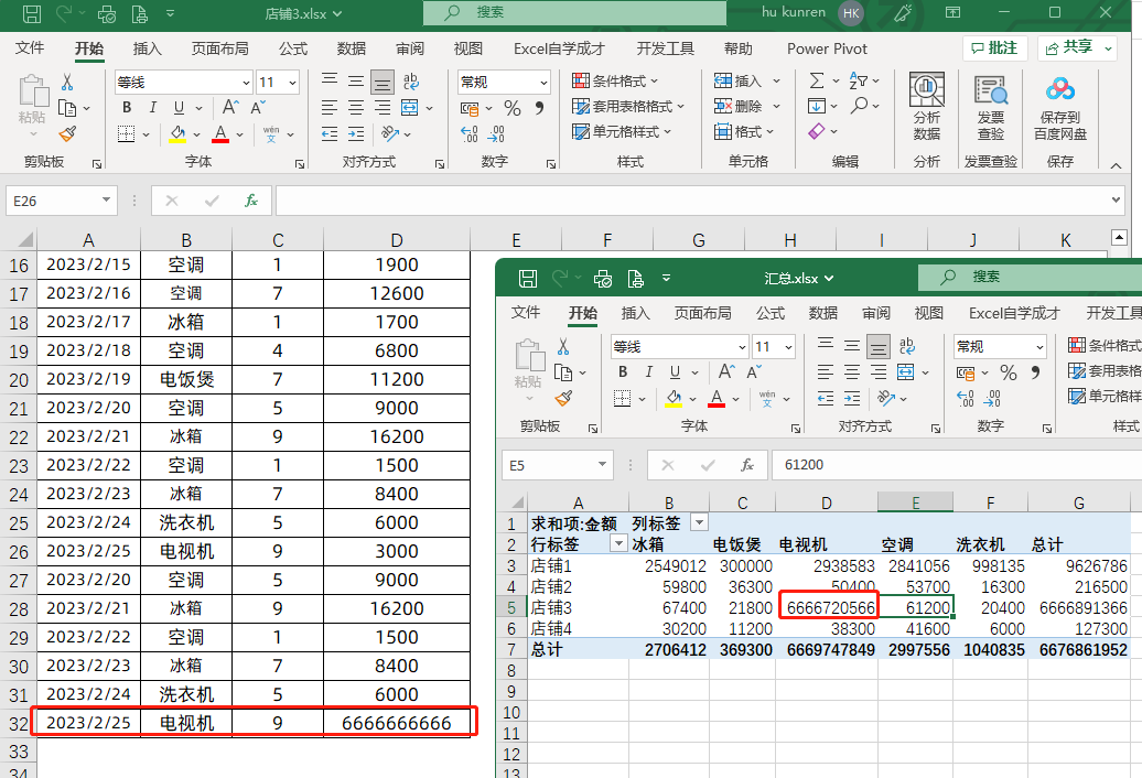 当我们原始表格里面的数据进行更新的时候,数据透视表点击刷新就能实时自动的刷新数据了,比如说我们在表3里面新增了一条销售记录, 销售金额66666666,在透视表里面刷新一下就能汇总