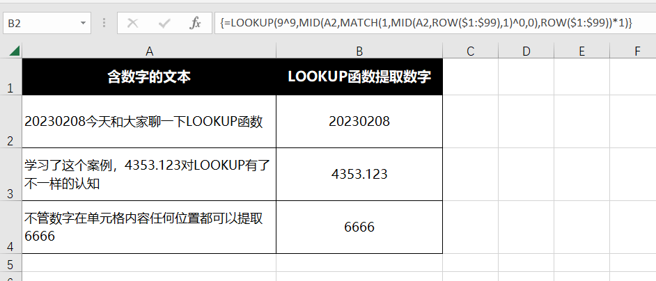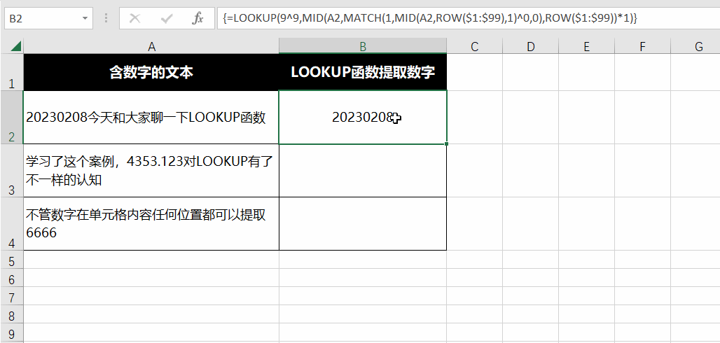 接着我们讲一下用公式提取数据的方法,在B2单元格输入公式:=LOOKUP(9^9,MID(A2,MATCH(1,MID(A2,ROW($1:$99),1)^0,0),ROW($1:$99))*1)然后按Ctrl Shift Enter三键结束,俗称数组公式。