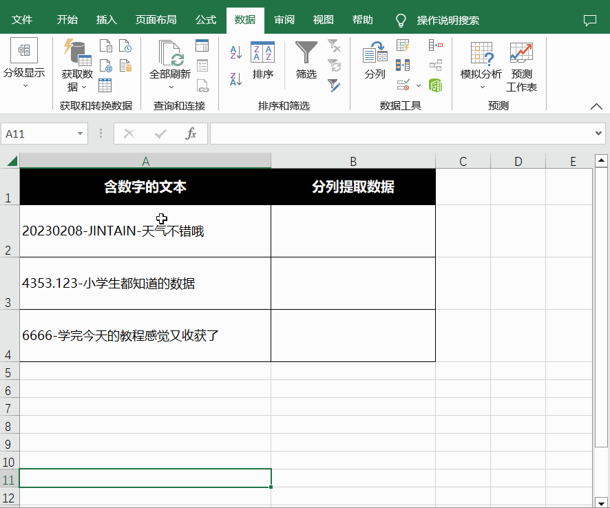 数据无规律的可以使用上面的方法进行拆分数据,如果遇到单元格内容数据有规律的,比如数字都在内容开头或者结尾,并且有分隔符在,我们可以使用分列的功能来快速实现,操作步骤如下图:
