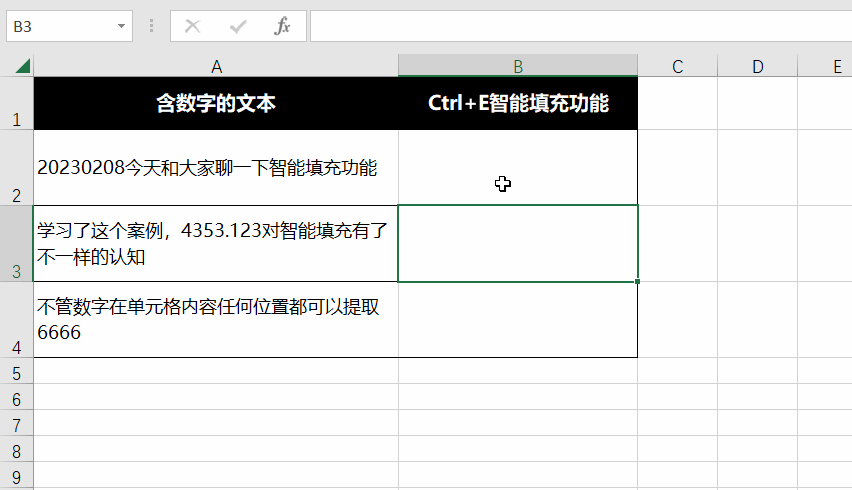 我们可以选中B2单元格,输入A2单元格的数字,比如是20230208这组数据,接着回车后定位在B3单元格,按快捷键Ctrl E就可以启用智能填充的功能了,但是会发现一个问题,智能填充因为数据量太少,填充的数据并不是我们想要的纯数字,所以我们选中B3单元格将多余的内容选中删除回车后就自动更新了后面的数据了。(注意这是智能填充使用时的一个隐藏的技巧,会随着我们数据更新而动态更新数据)