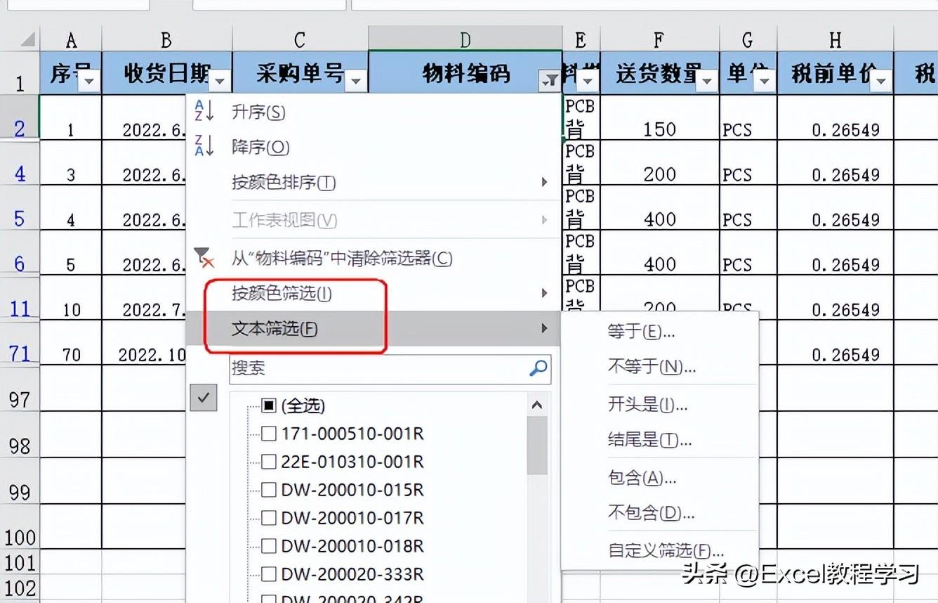 首先来看第一个示例,要筛选采购单号为“DW0731173”的所有物料送货信息。