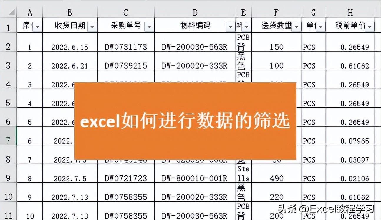 以下方数据表为例,这是一个物料采购送货的记录表,由于记录信息比较多,使用鼠标滑动来查看数据非常不方便,因此我们将利用筛选功能来查看送货信息。
