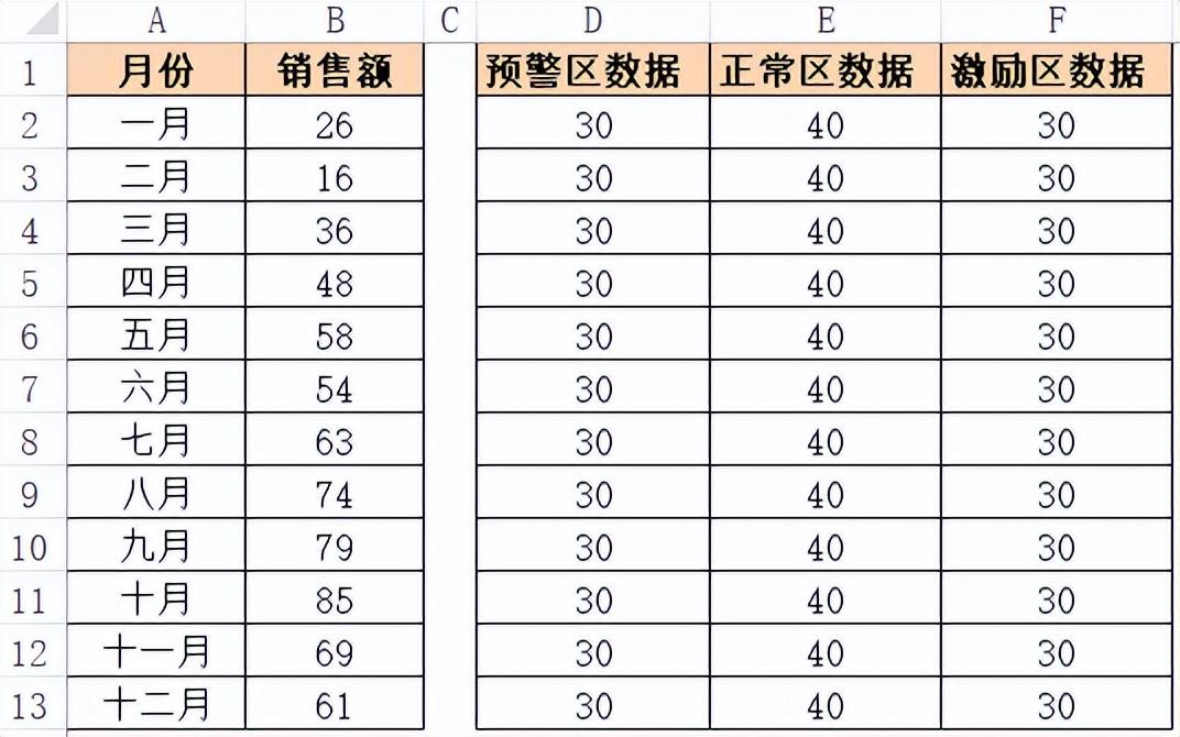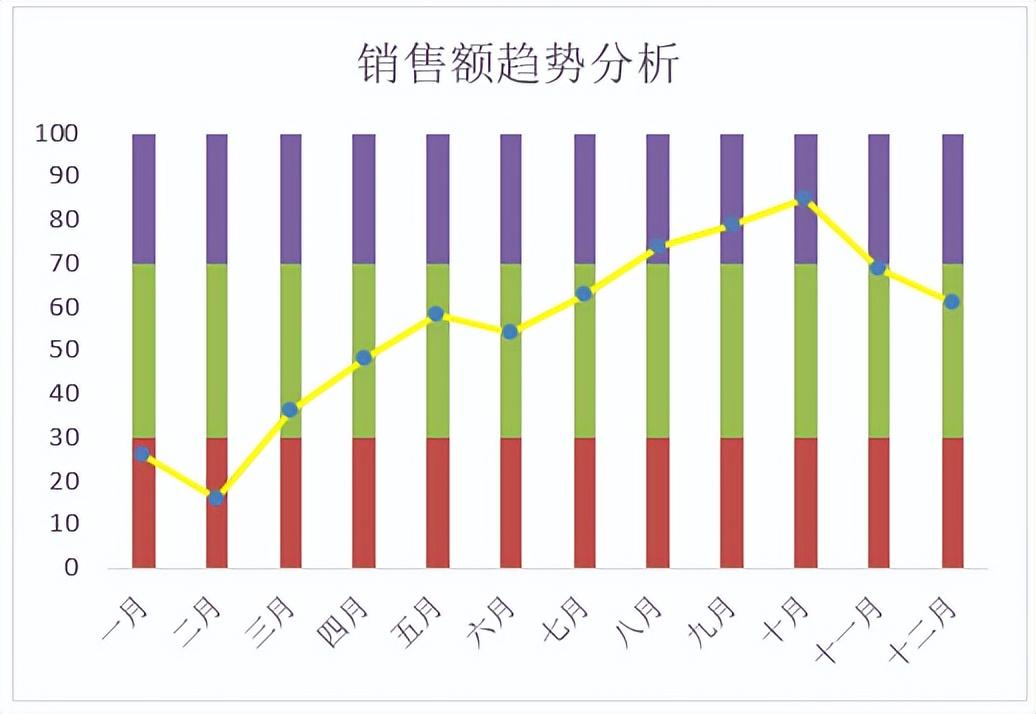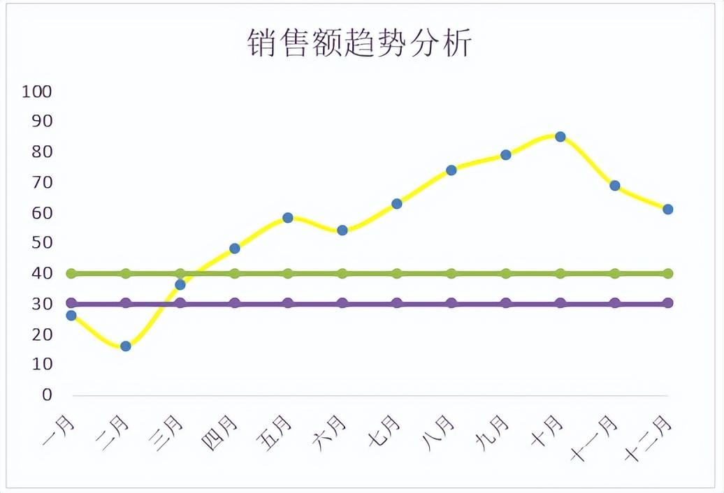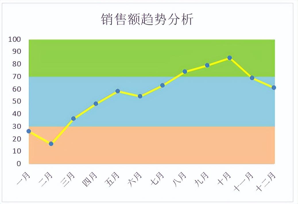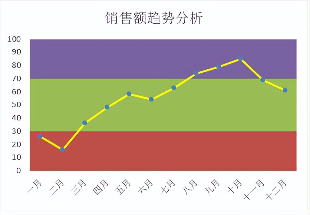 在Excel中常常会利用折线图制作趋势图,如果希望添加不同颜色带表示预警区、正常区、激励区如何实现呢?本文就来介绍利用增加辅助数据,结合堆积柱形图构成的组合图表来实现的方法。