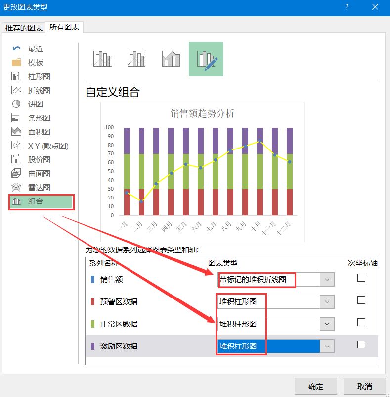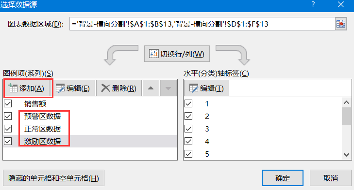 分别添加预警区数据、正常区数据、激励区数据三个数据系列