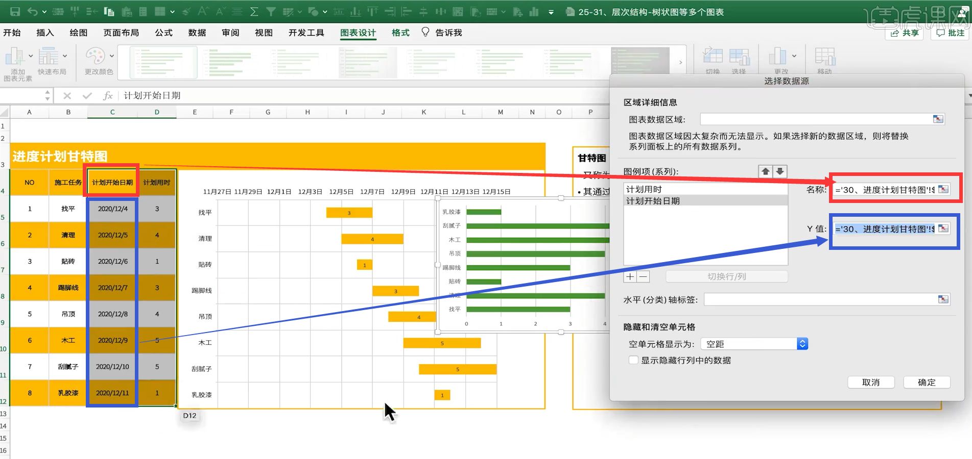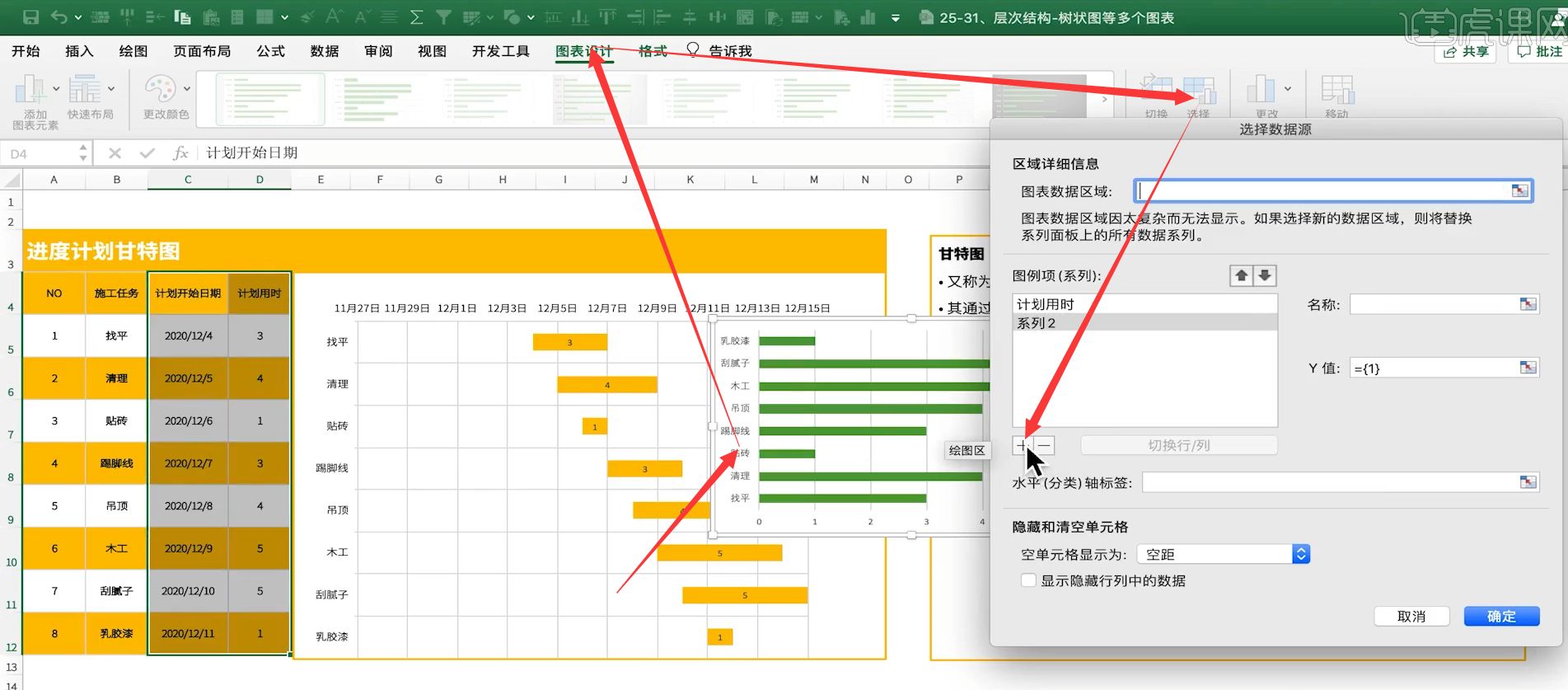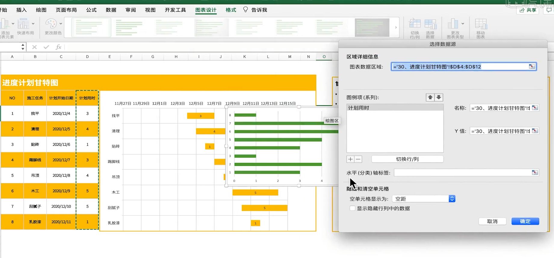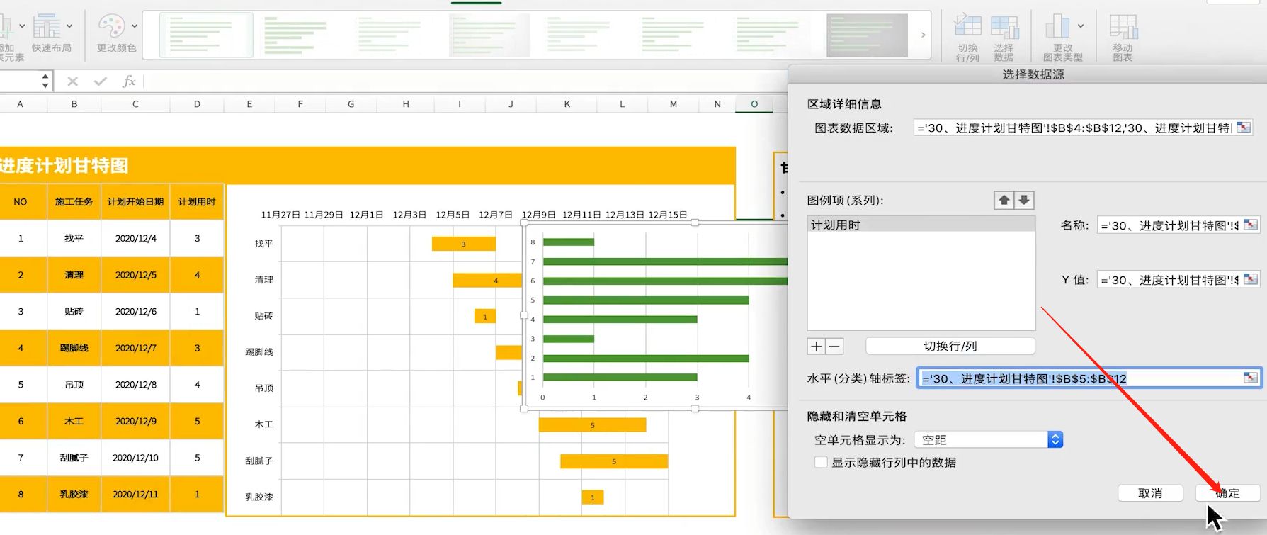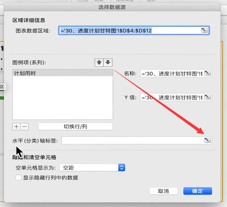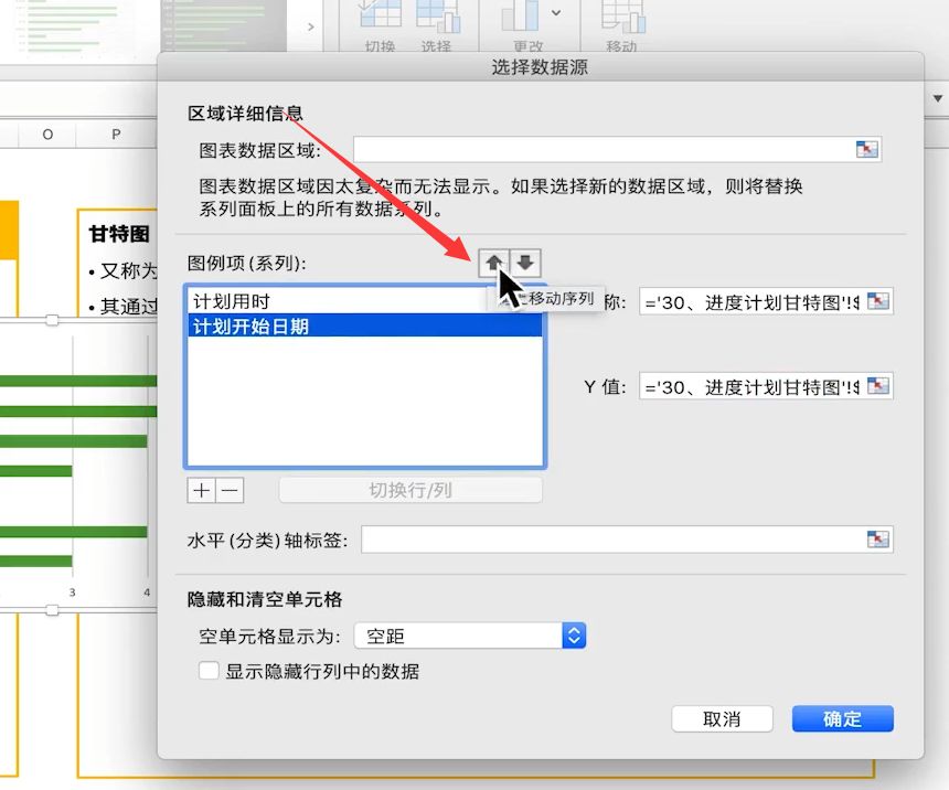 然后对添加的数据设置内容。名称选择“计划开始日期”,Y值选择下方数据。如图所示:
