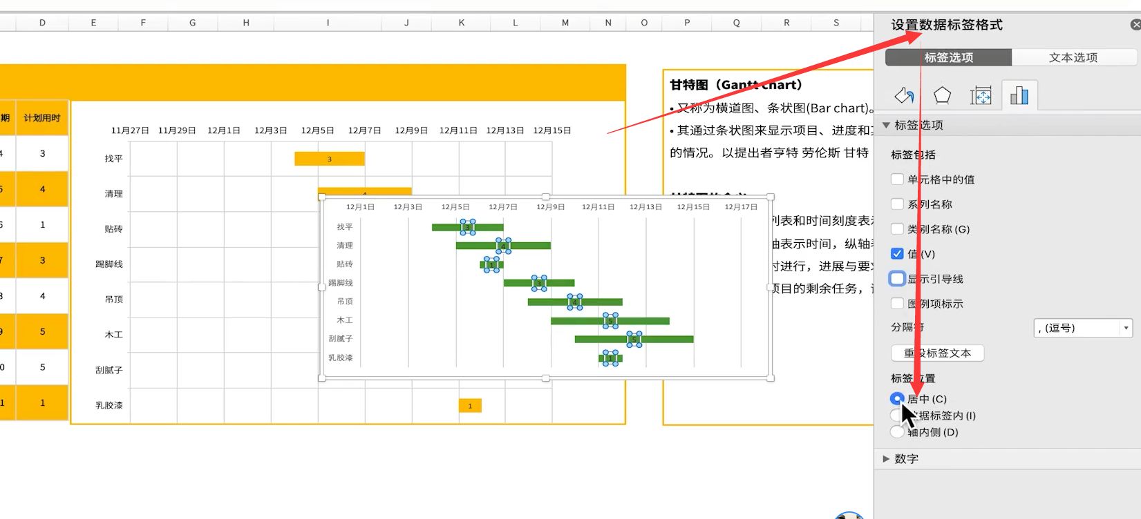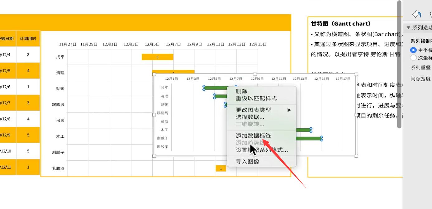 9、添加数据标签。选中计划用时条形图→右键→添加数据标签