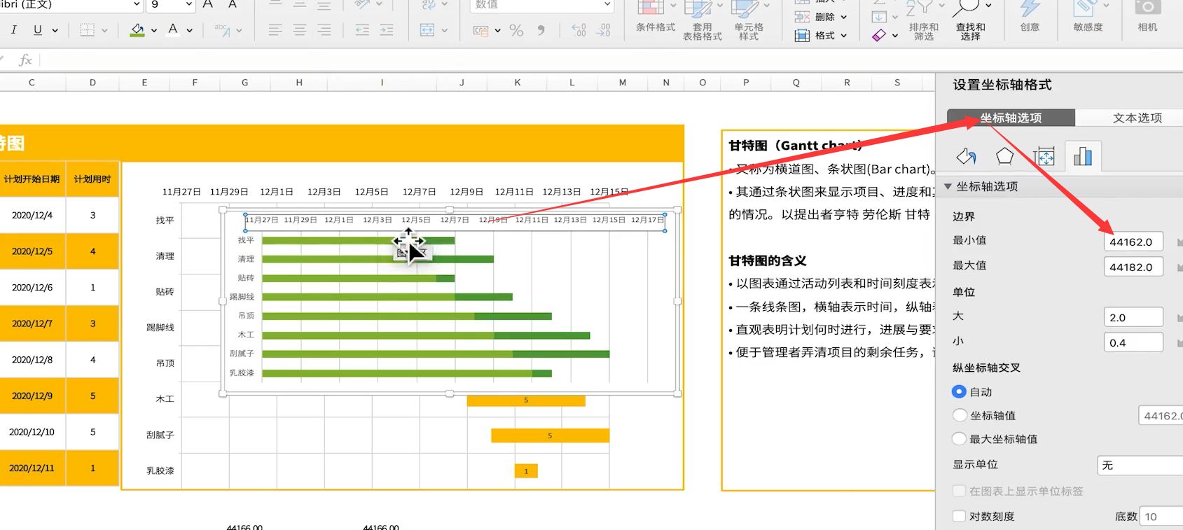 然后单击坐标轴选项→边界→最小值,设置为44166,44166是12月1日的数字形式。