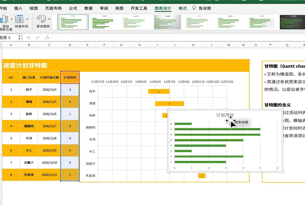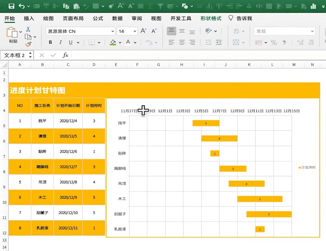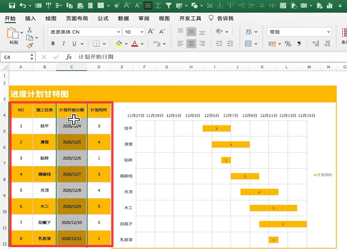 1、输入基础数据:就是序号、施工任务、计划开始时间、计划用时。