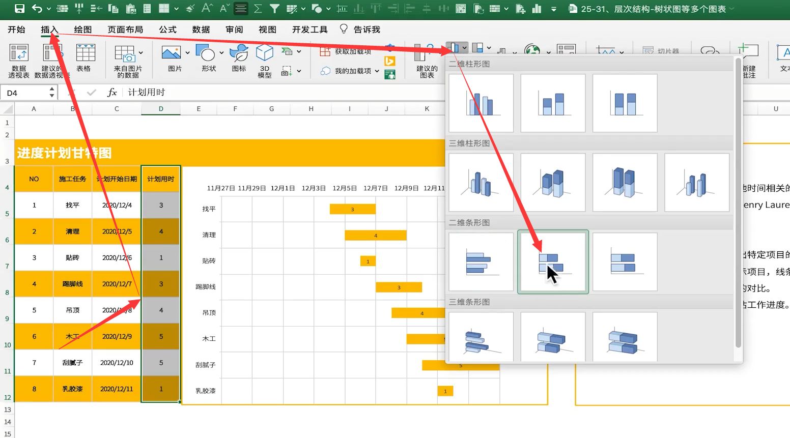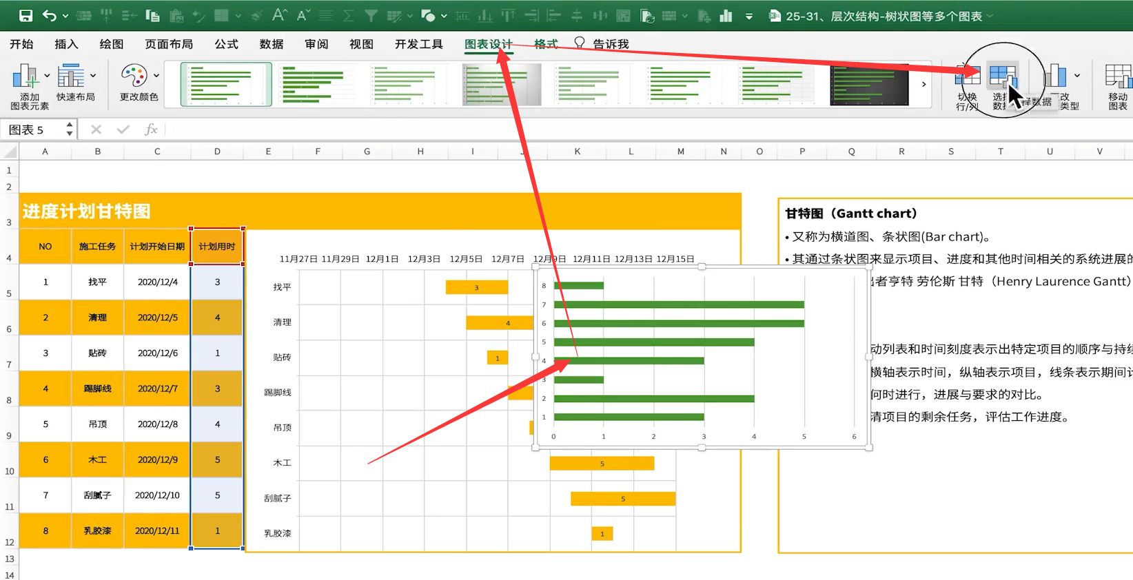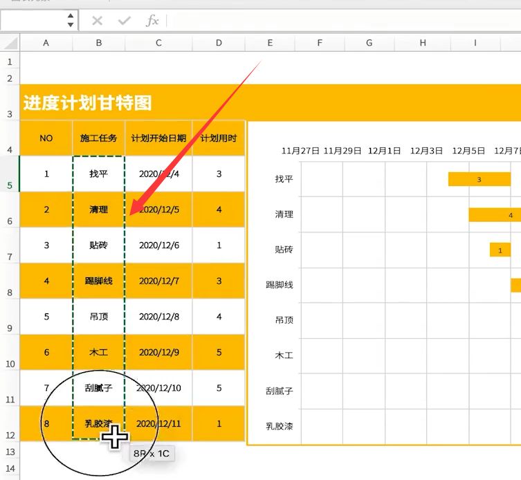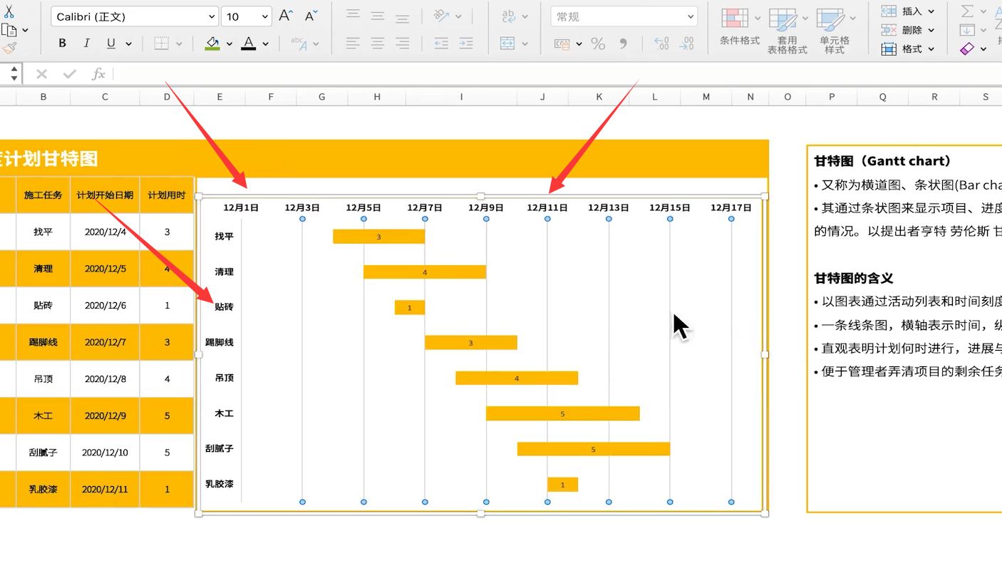 1、输入基础数据:就是序号、施工任务、计划开始时间、计划用时。