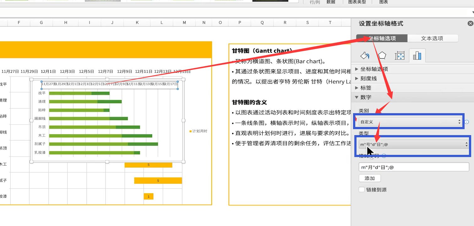 7、调整日期坐标轴。选中日期坐标轴,打开设置坐标轴格式→数字,类别选择自定义,类型设置成只有月日的格式,如下图所示: