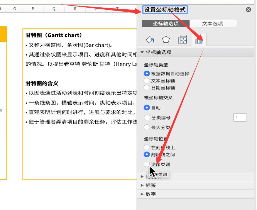 在弹出的对话框中单击坐标轴选项→坐标轴位置→逆序类别